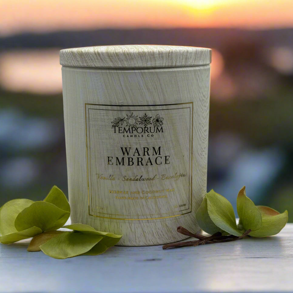 Experience the soothing aroma of our Warm Embrace candle, made with a blend of vanilla, sandalwood, and eucalyptus. Let the calming scents transport you to a state of relaxation and tranquility. Perfect for creating a cozy atmosphere or unwinding after a long day.